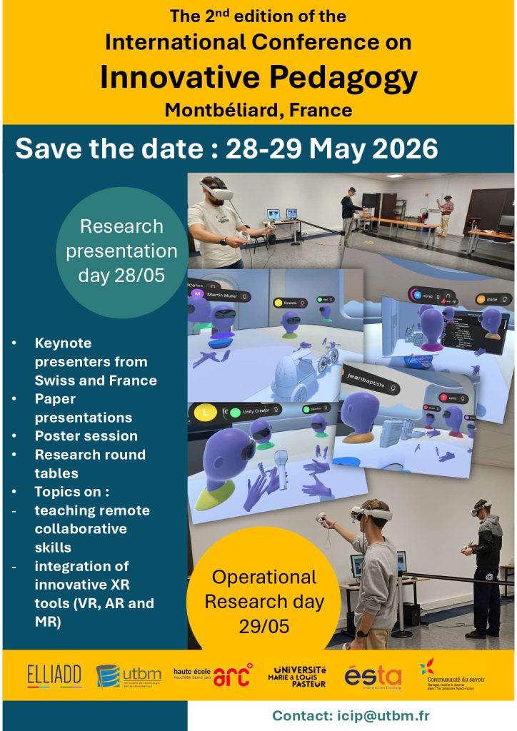 SAVE THE DATE : ICIP 2026 ICIP (International Conference on Innovative Pedagogy) est une conférence biennal internationale franco-suisse organisée à l’initiative de trois établissements universitaires en France (UTBM et ESTA) et en Suisse (HE-Arc) dans le but de permettre […]